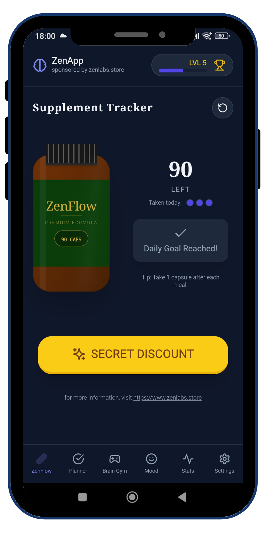 ZenFlow™ je váš každodenný spoločník pre tieto náročné chvíle. Vďaka zloženiu na podporu mysle vám pomôže udržať si tempo aj pod tlakom a zaistí, že zostanete pokojní a sústredení.